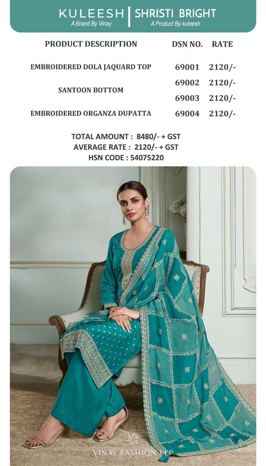 Looking for SHRISHTI BRIGHT BUY VINAY FASHION LATEST ONLINE SALWAR SUIT SETS Full Catalouge at Best Price? Buy Now SHRISHTI BRIGHT BUY VINAY FASHION LATEST ONLINE SALWAR SUIT SETS at Wholesale Rate of Rs 8480 with Total 4 from authroized dealer and supplier of VINAY FASHION LLP Brand. Cost of Each piece is just only Rs 2120 which is very low and affordable price to resale the product in your retail store. Devyanitextileexports is Surat based Wholesale Supplier & Dealer of VINAY FASHION LLP Brand. Click on Brand name to Know more about BELLIZA Brand's products.