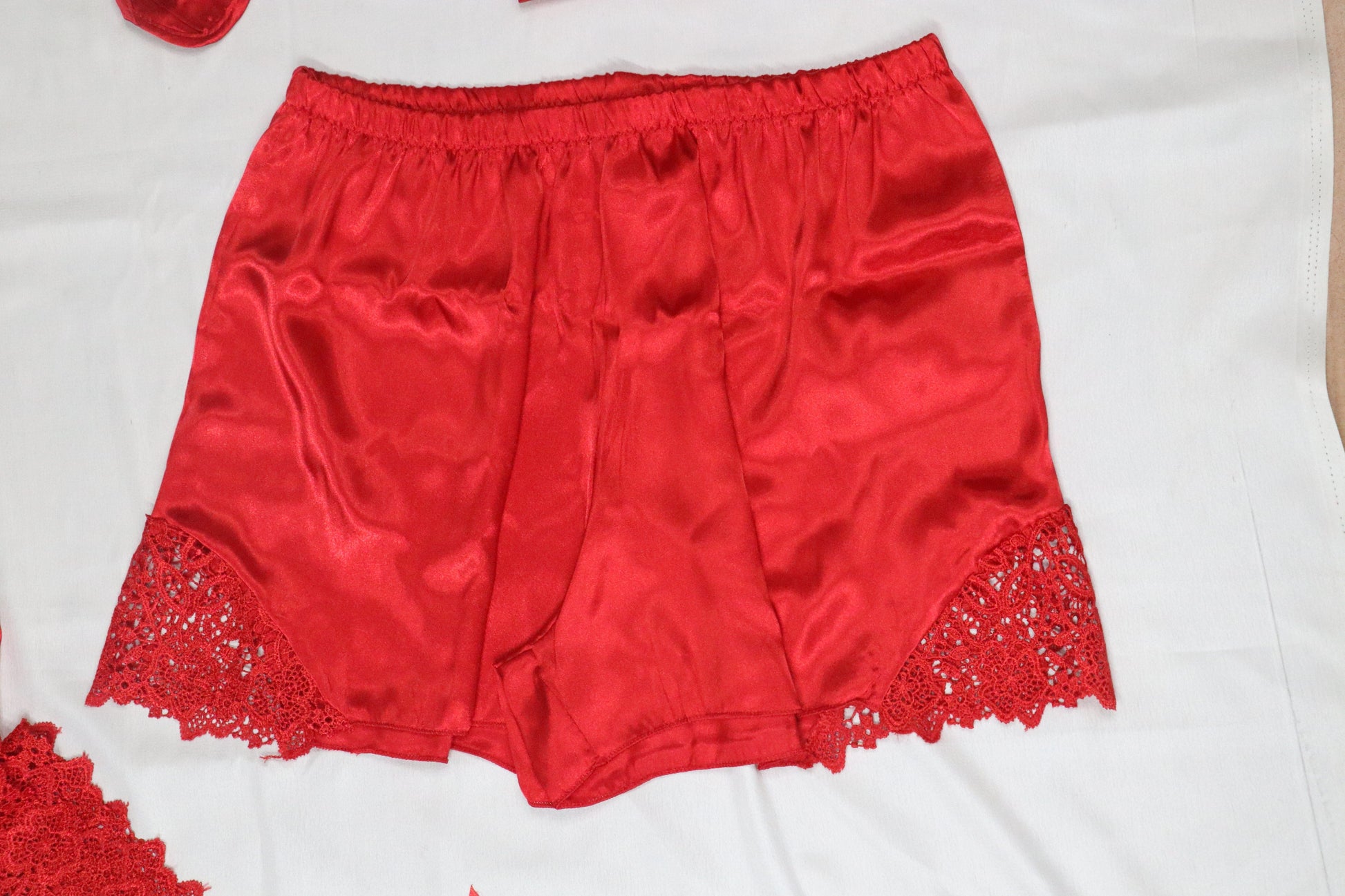 Experience luxury with this 6-piece lace set, featuring a 2 Shorts, Pajama , shirt , camisole, Eye Mask, and a thong or garter belt. Made from soft, high-quality lace for an elegant touch. Perfect for any special occasion or a touch of everyday glamour.