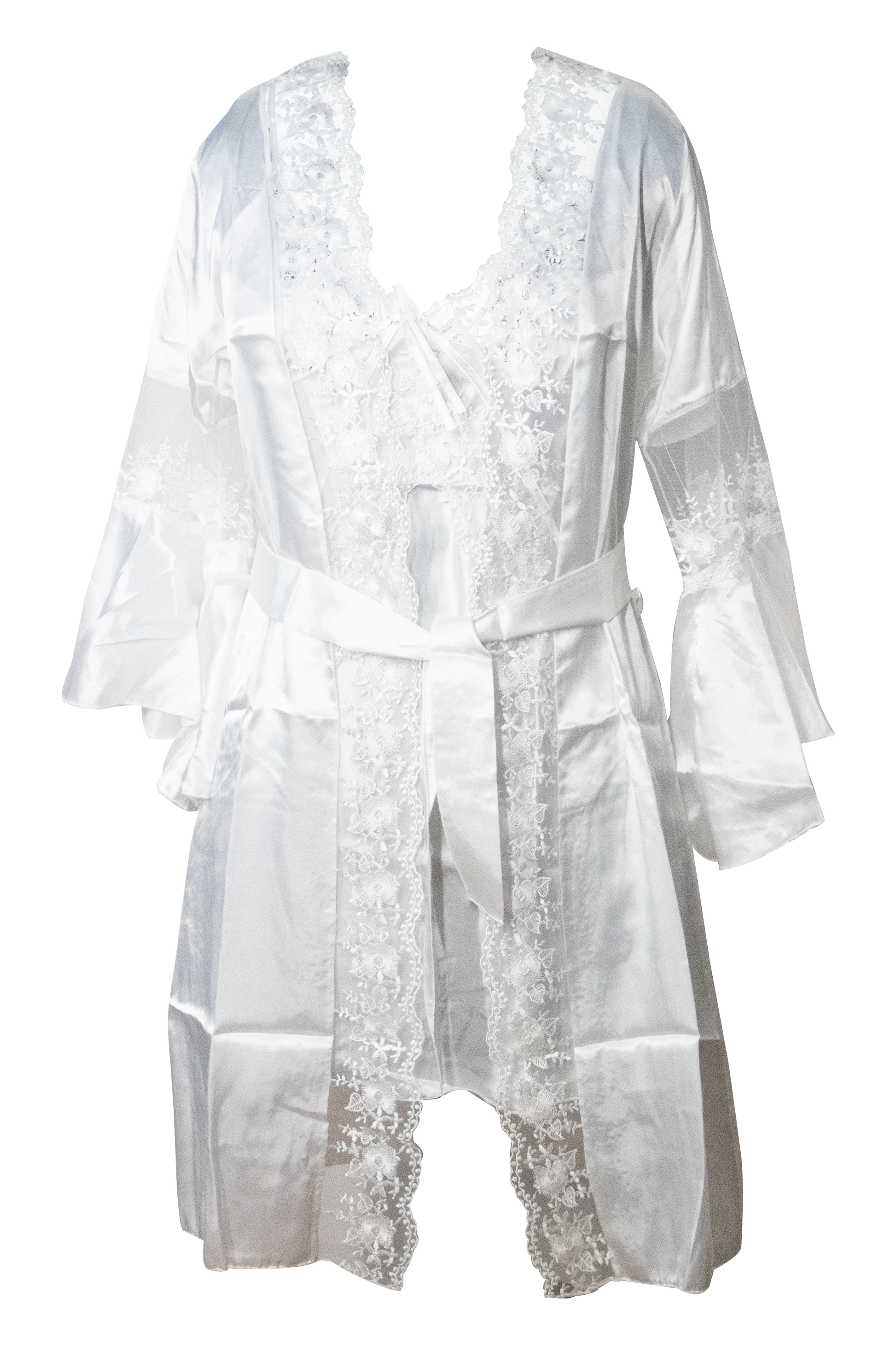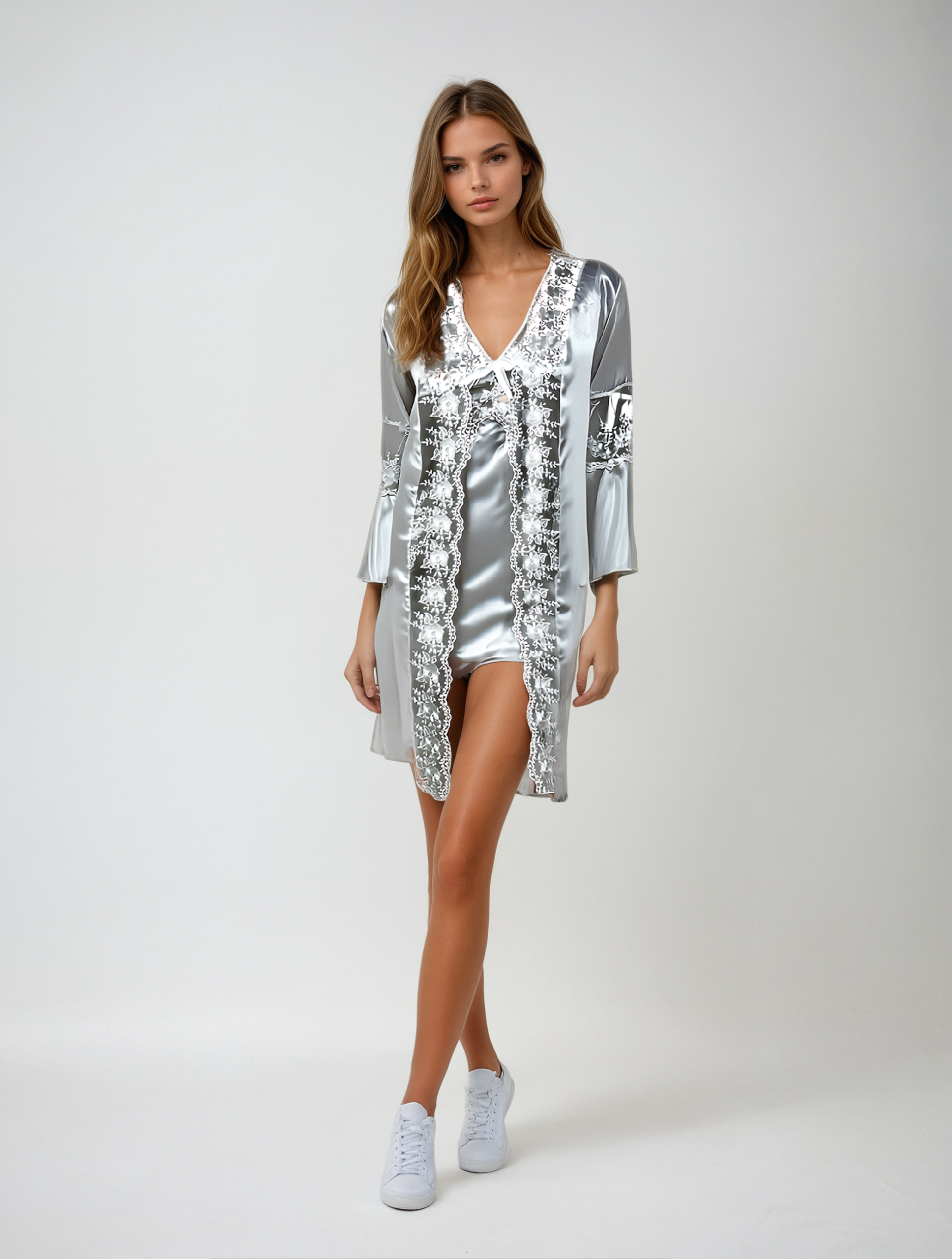 This set includes a silky satin nightgown and matching robe. Both pieces are soft and smooth, perfect for relaxing in style. Ideal for a comfortable and elegant night at home.